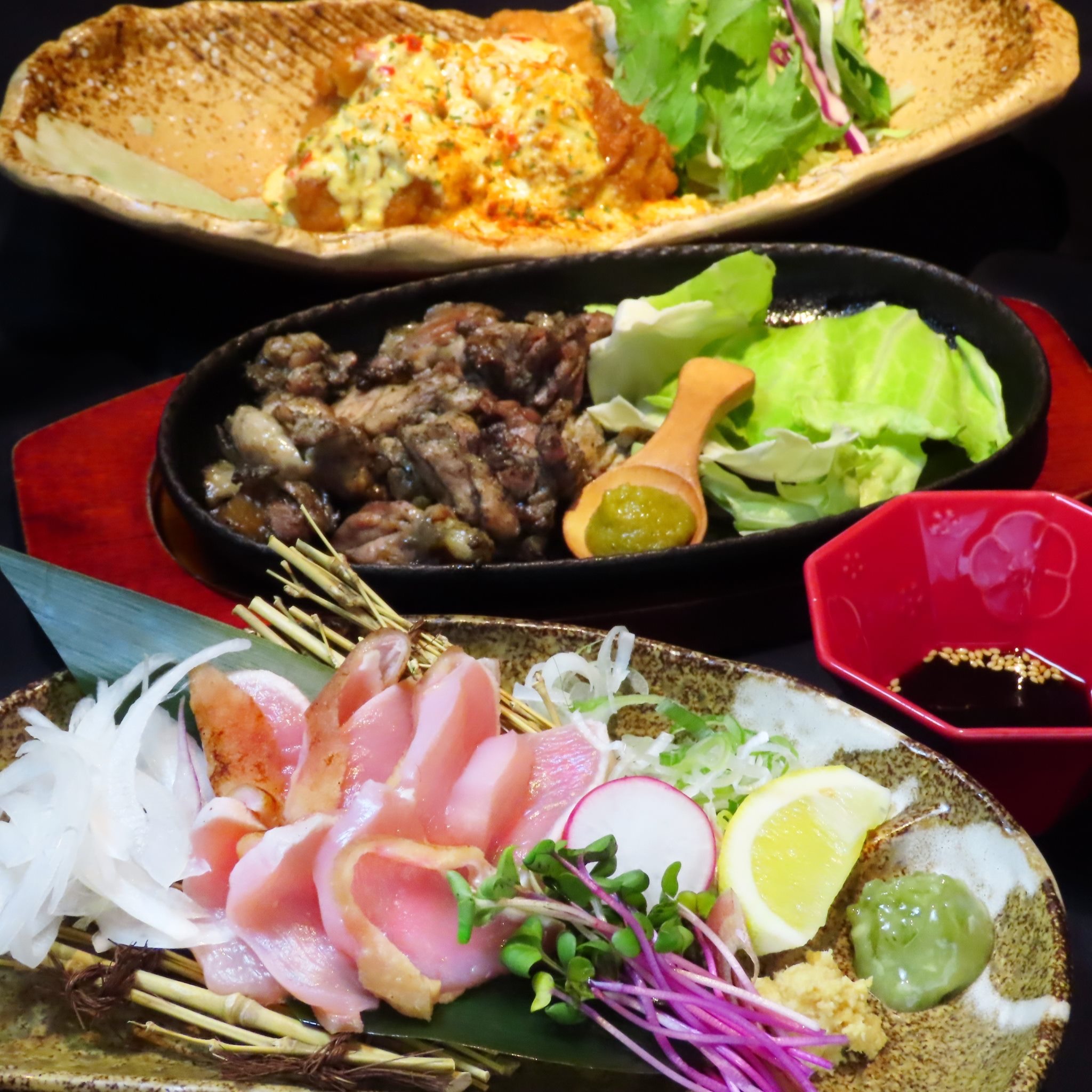 地鶏の炭火焼き、チキン南蛮など、